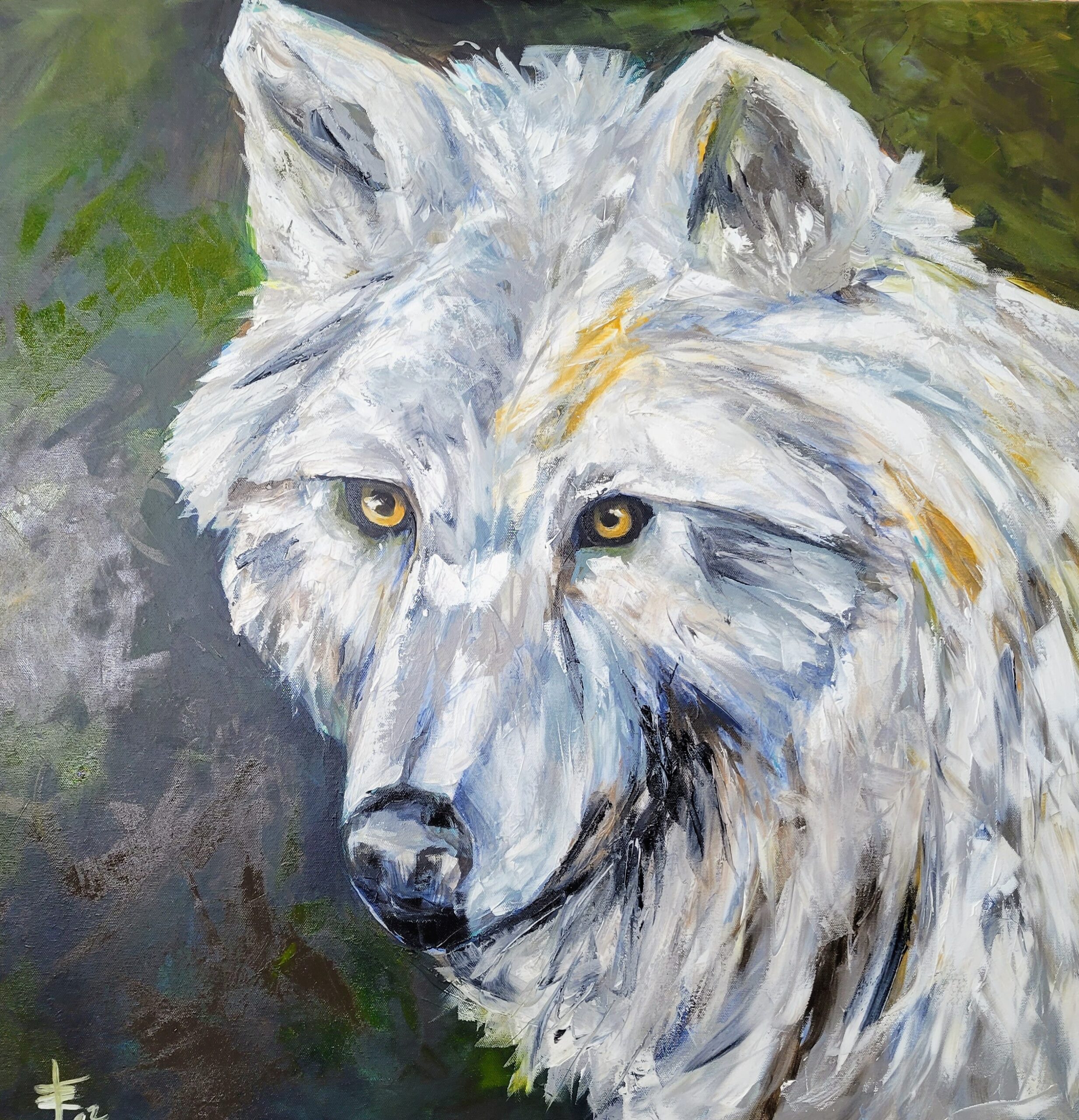 “Arctic Gaze” is a captivating 18″ x 18″ square painting that brings the spirit of the wild wolf to the forefront. Executed with a bold, contemporary technique, the portrait is characterized by heavy texture and energetic brushwork which gives the wolf’s white fur a dynamic, almost sculpted appearance, utilizing shades of gray, white, and subtle blue. The animal’s powerful presence is conveyed through its direct, intelligent amber/yellow eyes, which are the painting’s most magnetic focal point.
