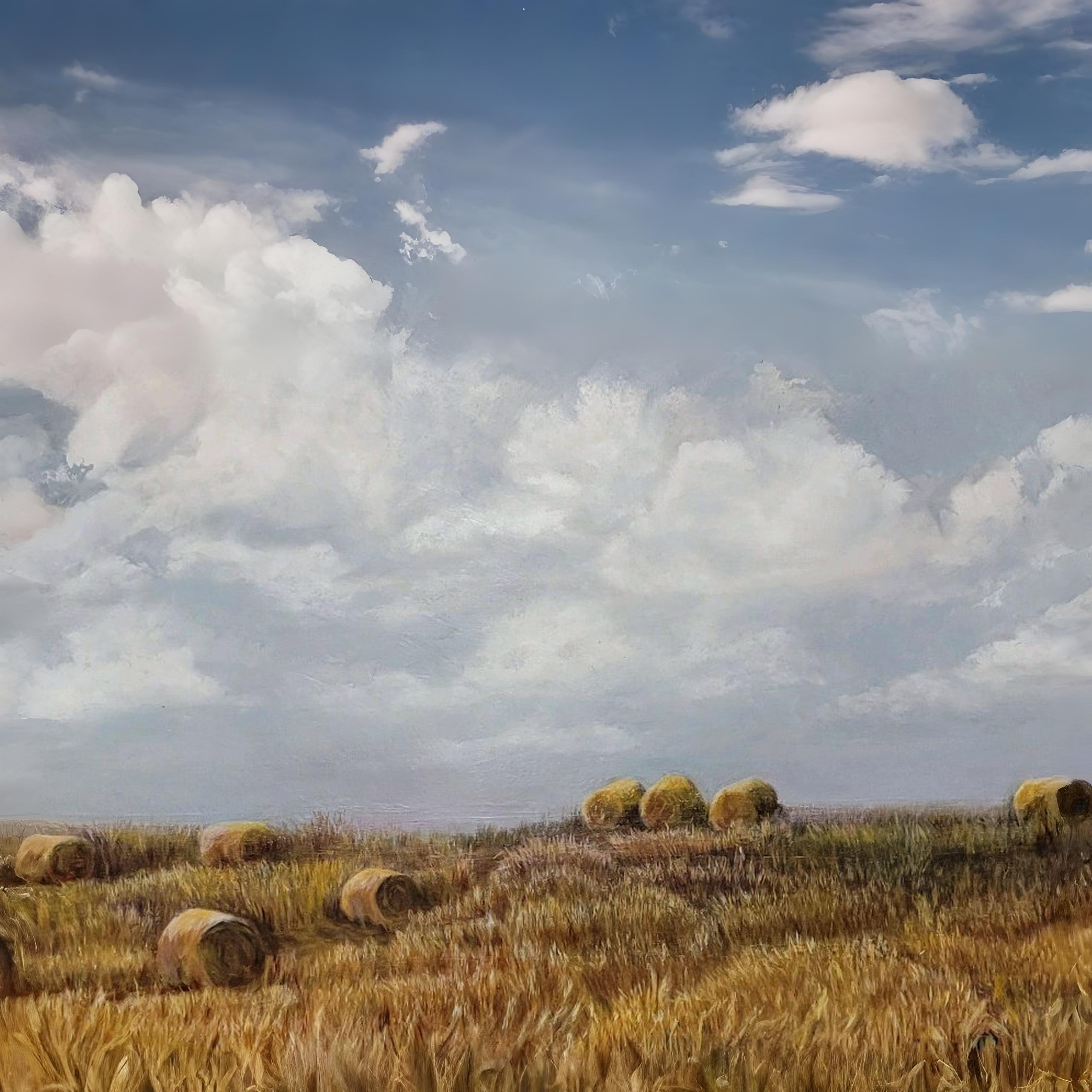 A sweeping, horizontal (24″ x 48″) oil landscape capturing the vast, tranquil expanse of a prairie at harvest time. The scene features multiple golden hay bales scattered across a richly textured field beneath a wide, atmospheric sky filled with soft, diffused light.