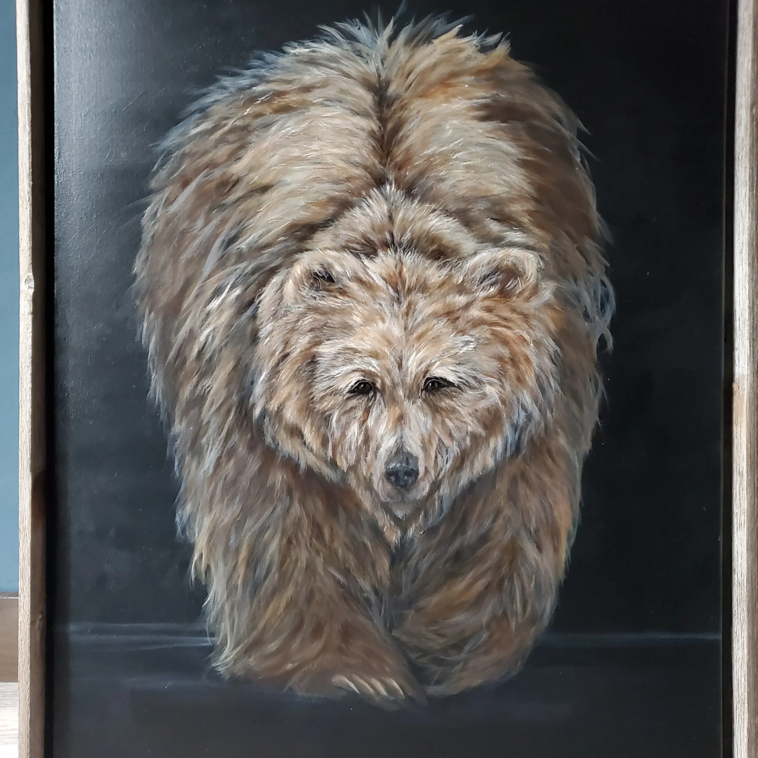 This powerful original artwork from Maggie Martin Studio is an intensive study in both realism and drama, capturing the imposing figure of a large bear as it advances toward the viewer. The artist uses a minimalist composition and a stark black backdrop to maximize the impact of the subject.