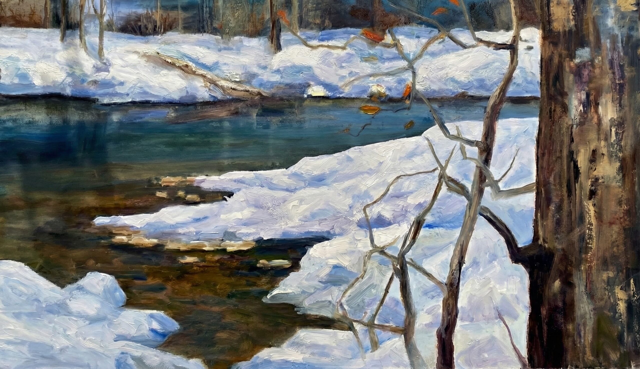 Atmospheric Detail: The artwork beautifully contrasts the deep, reflective blues of the water against the bright, textured whites of the snowbanks, capturing the unique clarity of morning light.